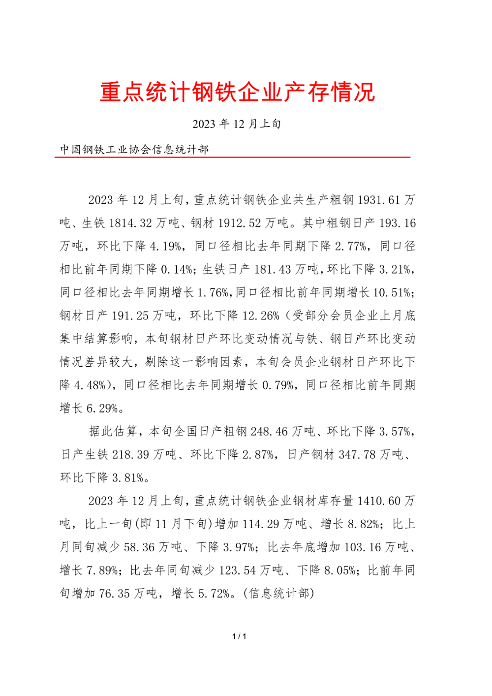 中钢协数据显示,2023年12月上旬,重点统计钢铁企业共生产粗钢1931.61万吨、生铁1814.32万吨、钢材1912.52万吨。其中粗钢日产193.16万吨,环比下降4.19%,同口径相比去年同期下降2.77%,同口径相比前年同期下降0.14%;生铁日产181.43万吨,环比下降3.21%,同口径相比去年同期增长1.76%,同口径相比前年同期增长10.51%;钢材日产191.25万吨,环比下降12.26%,同口径相比去年同期增长0.79%,同口径相比前年同期增长6.29%。
