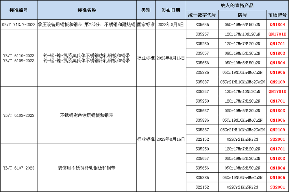 8月16日,工业和信息化部发布2023年第17号公告,批准《工业用导电和抗静电橡胶板》等412项行业标准。QN系列不锈钢新产品纳入《铬-锰-镍-氮系奥氏体不锈钢冷轧钢板和钢带》《铬-锰-镍-氮系奥氏体不锈钢热轧钢板和钢带》《不锈钢彩色涂层钢板及钢带》及《装饰用不锈钢冷轧钢板及钢带》等4项行业标准。