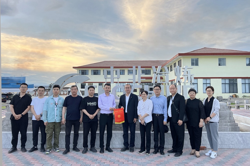 在新落成的中非冶炼办公大楼前,张维仁向中非冶炼赠送了侨联“中国梦,侨联情”锦旗。